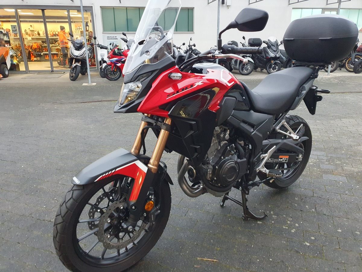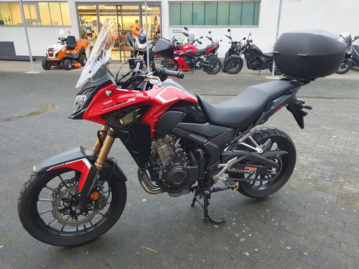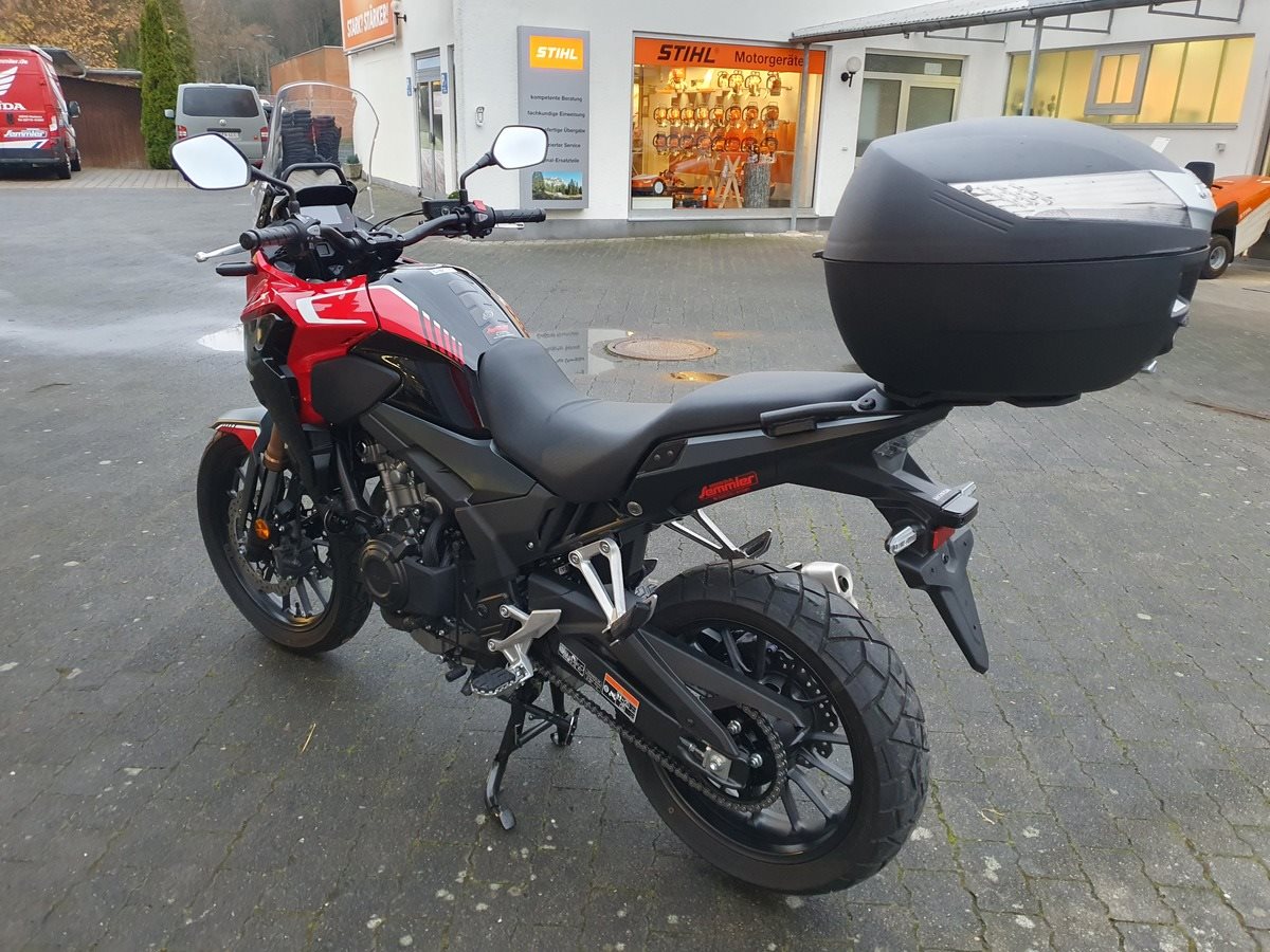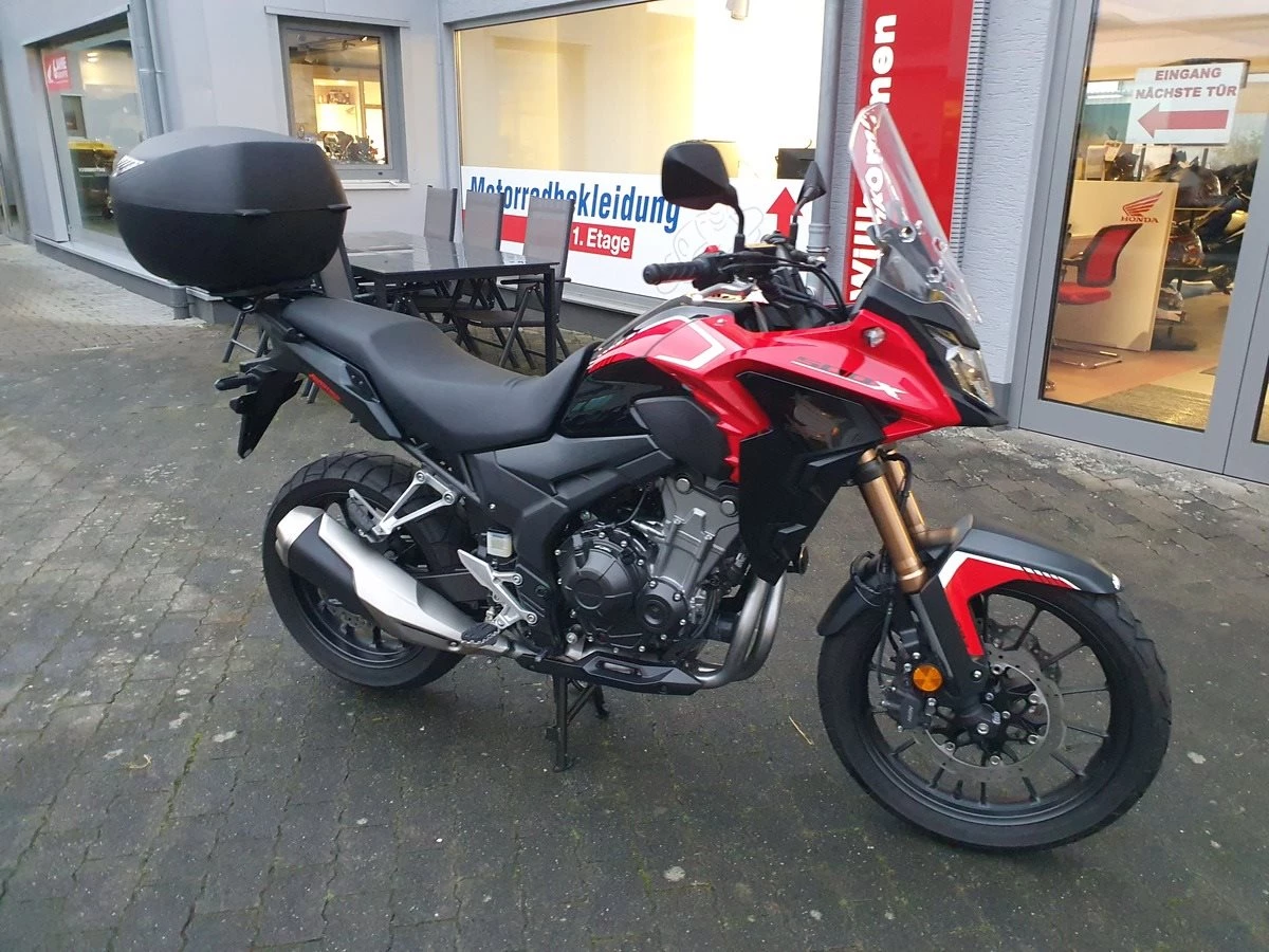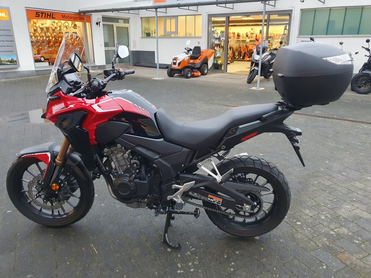 Honda CB500X in grand prix red aus 1. Hand in sehr guten Zustand! Die CB hat Komfortfußrasten und einen Hauptständer von SW-Motech. Desweiteren ist eine 12 Volt Steckdose im Cockpit verbaut und ein Top-Case montiert. Die Maschine ist Scheckheftgepflegt, hat gerade von uns einen frischen Service bekommen und wird mit einem Jahr Gewährleistung verkauft. An der rechten Seite sind ein paar kleine Kratzer an Auspuff, Fußraste und Lenkerende zu sehen, da der Vorbesitzer an seiner Garagenwand hängen geblieben ist. Bitte den Bildern entnehmen.