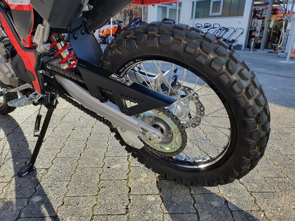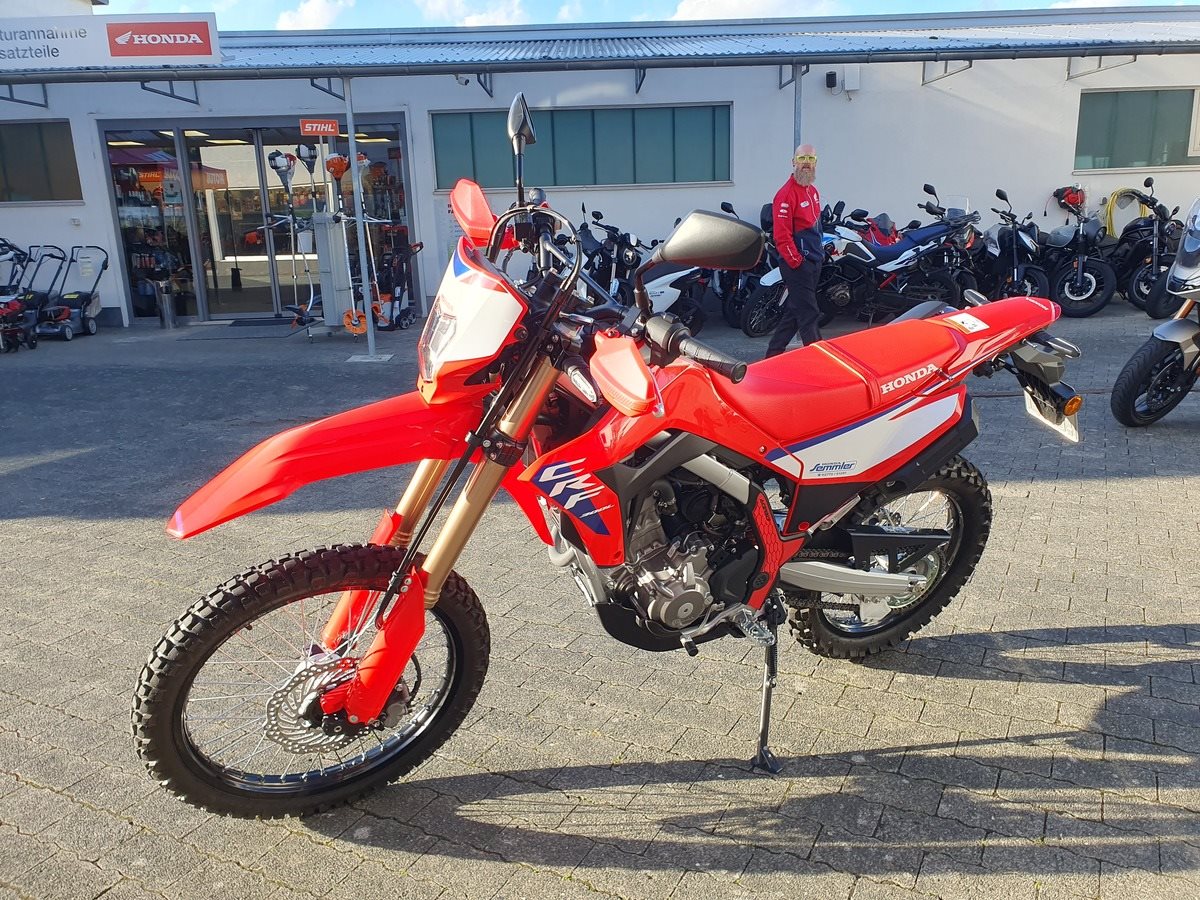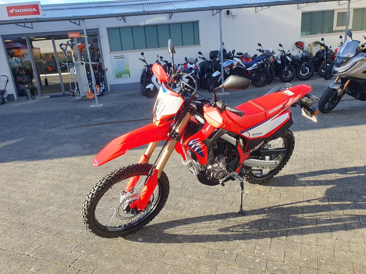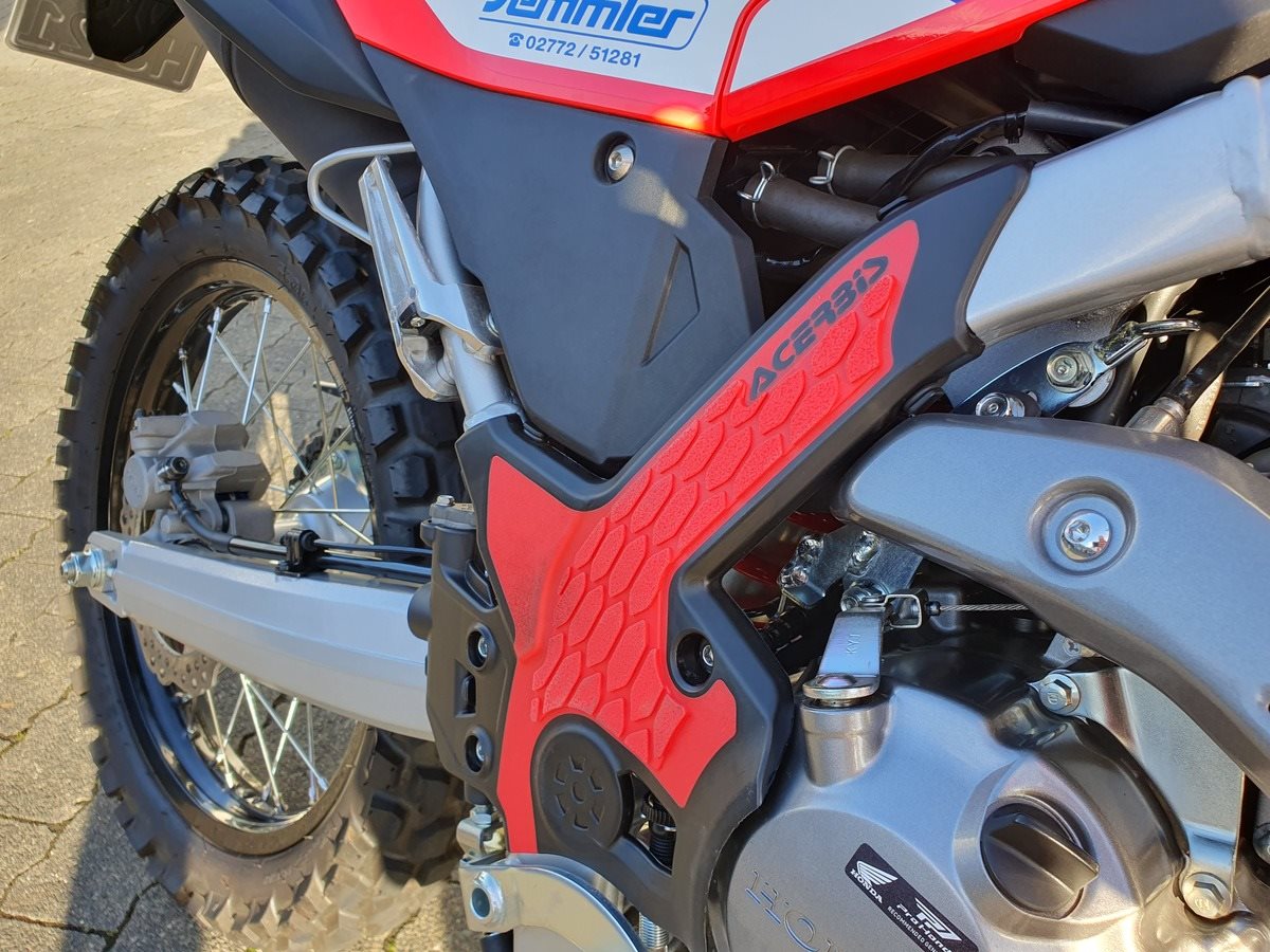Honda CRF300L in Extreme Red mit Handguards, Acerbis Rahmen und Motorschutz. Die Maschine diente in 2025 als unser Vorführbike und hat nur 700KM gelaufen.