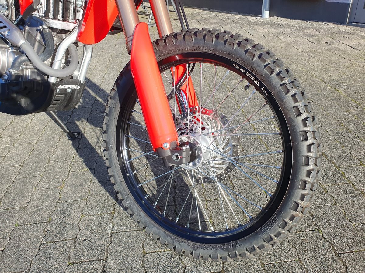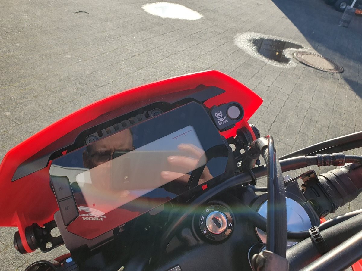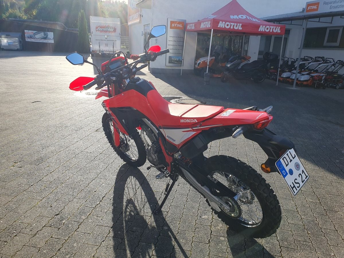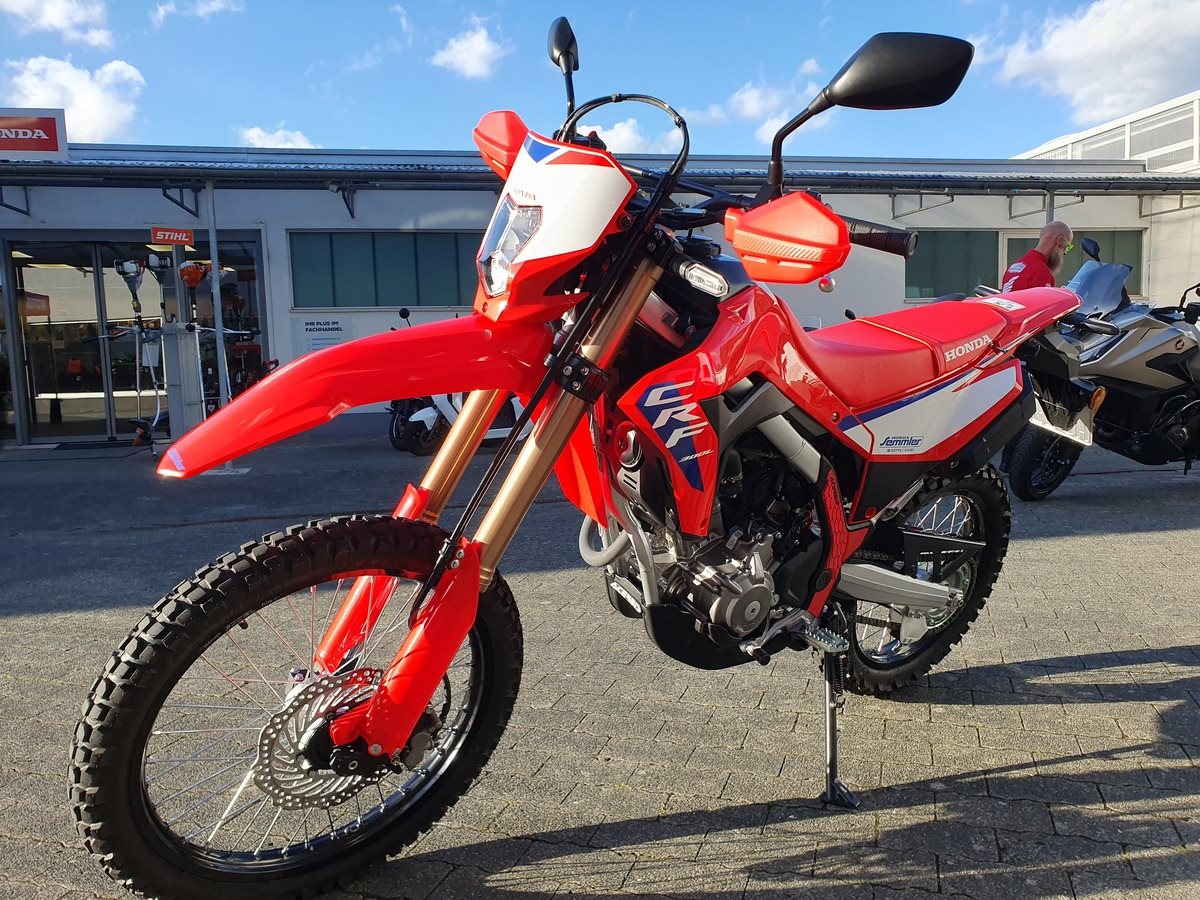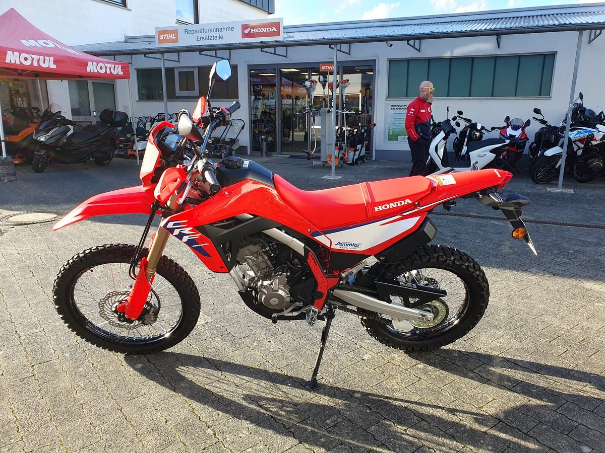 Honda CRF300L in Extreme Red mit Handguards, Acerbis Rahmen und Motorschutz. Die Maschine diente in 2025 als unser Vorführbike und hat nur 700KM gelaufen.