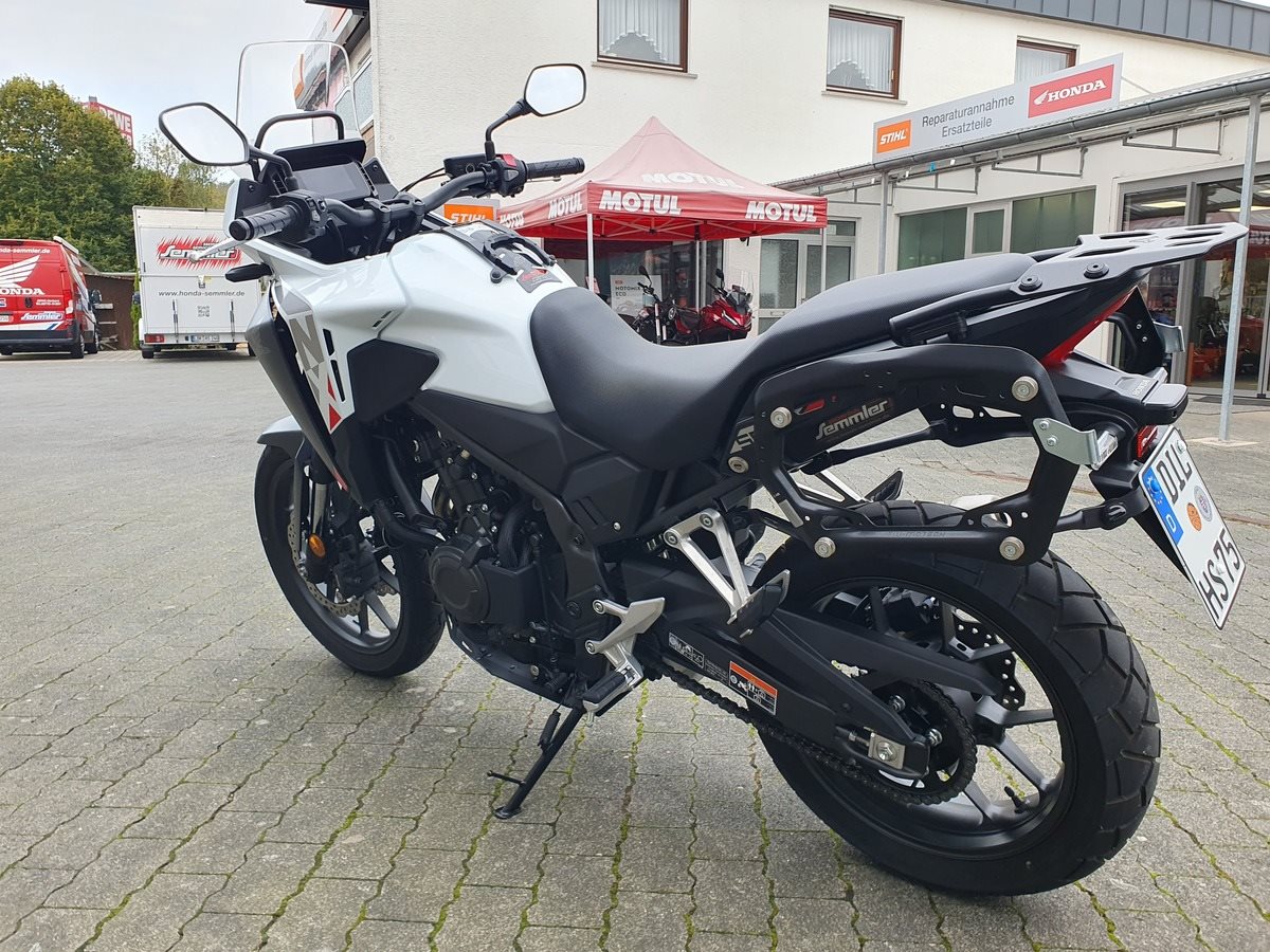 Honda NX500 MY2024 mit SW-Motech Kofferträgern, Alu Rack (Gepäckträger für Top-Case), SW-Motech Motorschutz und Pro Tankring. Die Maschine ist unfallfrei. Mit 5 Zoll TFT Display und Honda RoadSync-Konnektivität in Horizon White sofort VERFÜGBAR! - 48 PS Klasse passend für den A2 Führerschein. Vorführbike mit nur 3.500 Kilometer. Die Maschine ist einmal auf die Linke Seite umgefallen. Davon sind noch kleine Macken zu sehen.