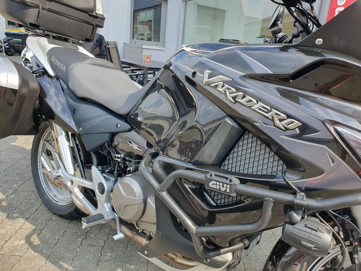 Honda XL1000V Varadero Typ SD02 aus 2009, Scheckheftgepflegt mit nur 24.000 KM. Die Maschine ist aus 3. Hand und vom Vorbesitzer Tiefer gelegt. An der Varadero ist alles dran was man zum Reisen braucht! Koffersystem mit Top-Case, Sturzbügel mit Zusatzscheinwerfern, Griffheizung, USB Anschluß, Ganganzeige und auch ein Navi Halter. Wir haben die große 24.000er Inspektion durchgeführt. Die Reifen sind dast Neu und der TÜV wird bei Verkauf Neu gemacht. An der rechten Seite ist eine Delle im Tank.