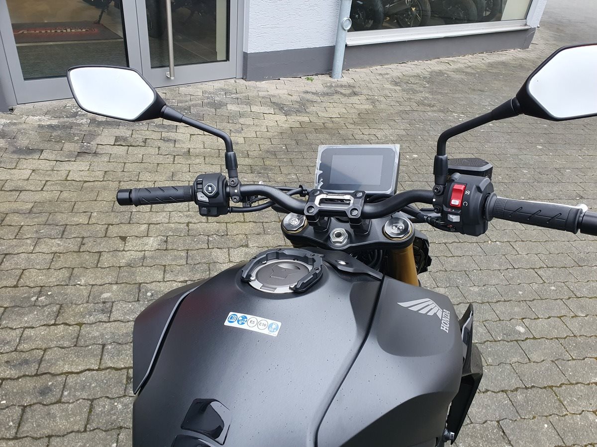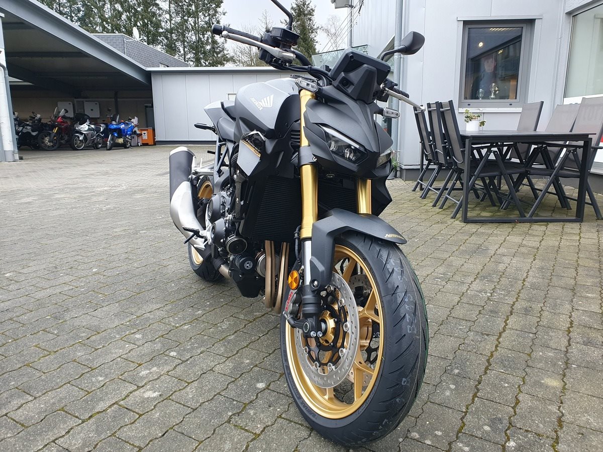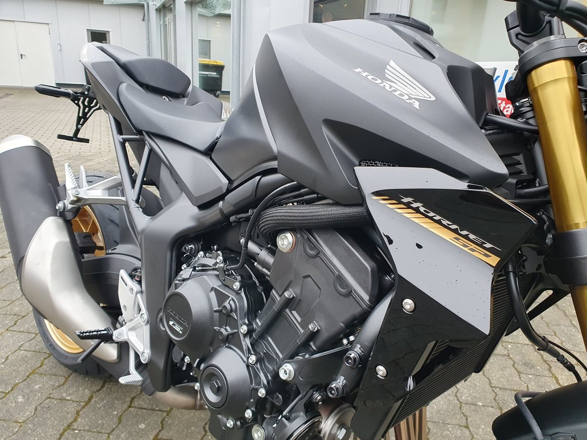 Die neue CB1000 Hornet SP mit ihrem Vierzylindermotor ist ein erstklassiges Naked Bike, das den Asphalt zum Glühen bringt. Throttle By Wire sorgt für präzise Kontrolle, während das Fahrwerk mit der einstellbaren SHOWA 41mm SFF-BP Upside-Down-Gabel und dem Öhlins TTX36 Pro Link Aufhängung ausgestattet ist. Die unverfälschte, aggressive Streetfighter-Attitüde wird durch einen markanten LED-Doppelscheinwerfer unterstrichen. Der 5-Zoll-TFT-Farbbildschirm und die Honda RoadSync-Konnektivität sorgen für die nötigen Informationen. Kann es losgehen?