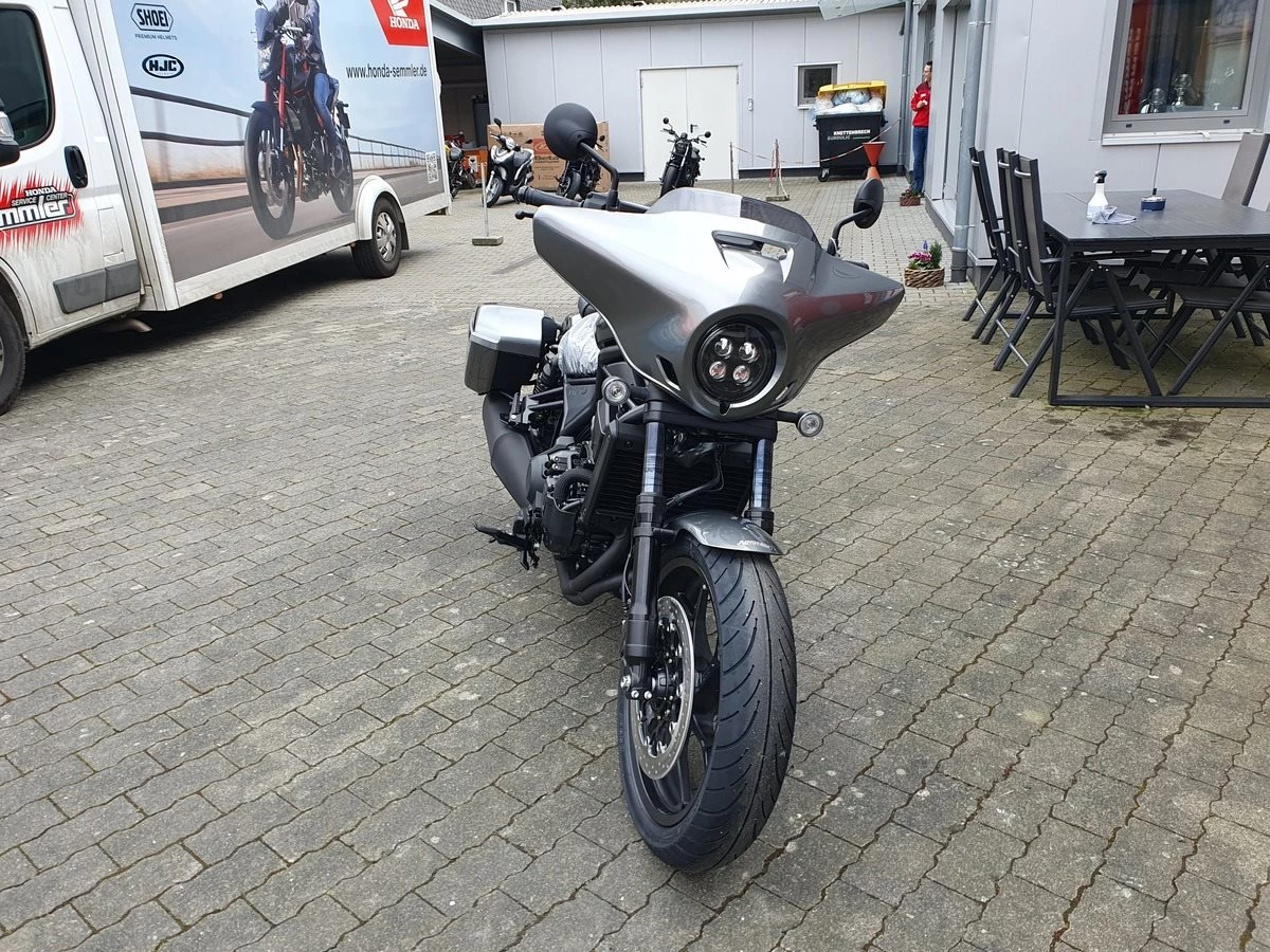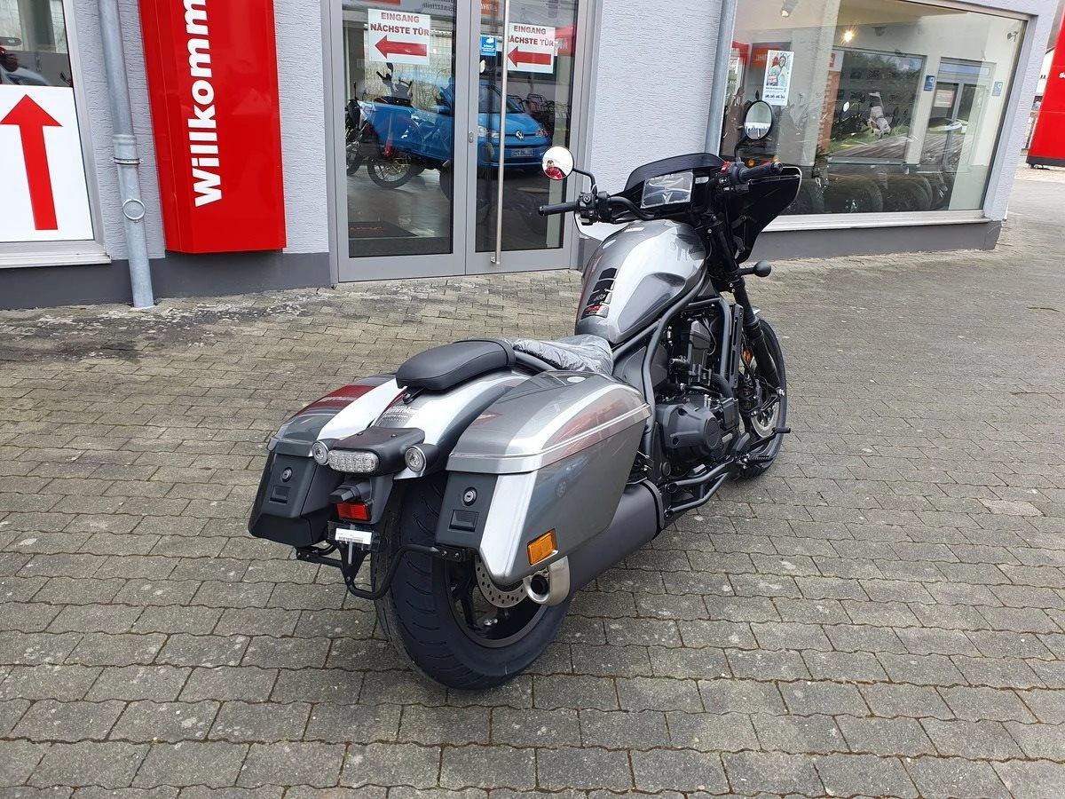 Honda CMX1100 Rebel 1100 Tour mit DCT Getriebe. NEUFAHRZEUG ohne Zulassung. SOFORT VERFÜGBAR Modelljahr 2025. Die entspanntere Sitzposition mit erhöhtem und in Richtung des Fahrers nach hinten versetztem Lenker, nach vorn versetzten Fußrasten und 10 mm höherem Sitz bietet mehr Komfort und Sicherheit. Hinzu kommt das neue 5-Zoll-TFT-Display mit Smartphone-Konnektivität per Honda RoadSync, mit dem du unterwegs auf dem Laufenden bleibst. Mit Seitenkoffern und toller Frontverkleidung.